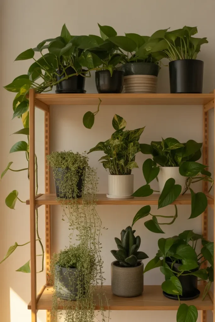 Pothos thrives in low to medium light, making it a great companion for other shade-loving plants.