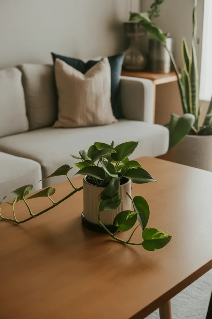 Place a small pothos plant in the center of your dining or coffee table, letting the vines trail gently across the surface.