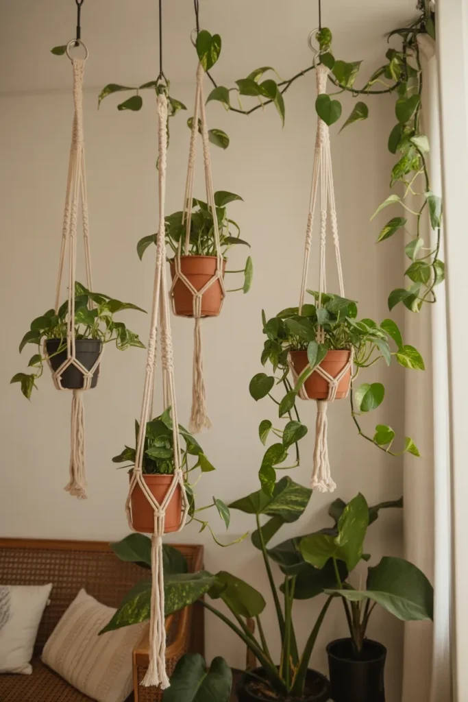 Hanging pothos plants instantly add depth and dimension to any room. Use macramé hangers or ceiling hooks to let the vines cascade beautifully.