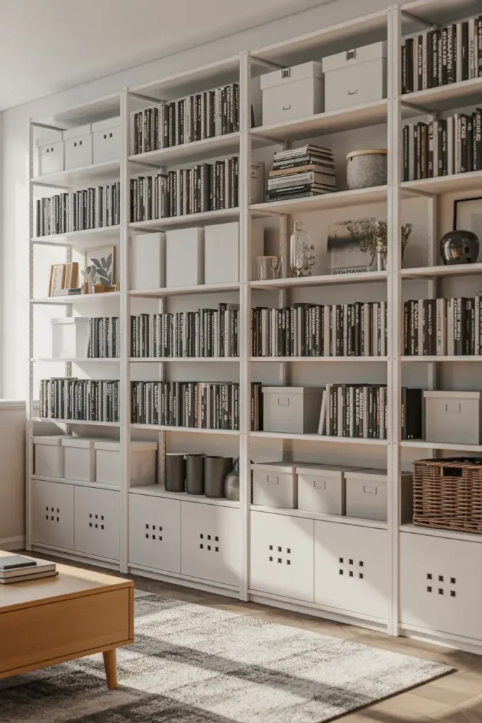 A basic IKEA bookshelf can do so much more than hold books. By placing multiple units side by side or stacking them vertically, you can create a full storage wall for your living room or bedroom.
