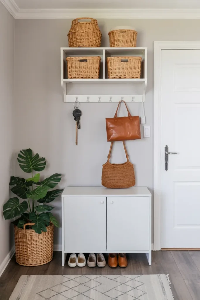 Entryways can quickly become cluttered with shoes, bags, and keys. Transform a simple IKEA cabinet into a sleek entryway organizer by adding hooks, trays, and baskets.
