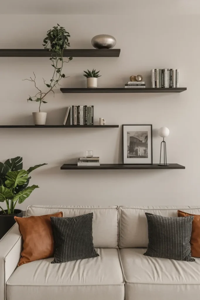 Floating shelves are perfect for combining storage with style. Use them to display decorative items while also storing everyday essentials.