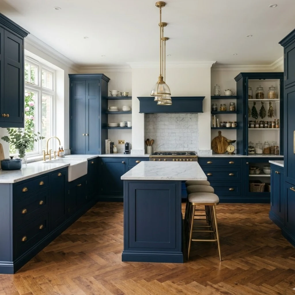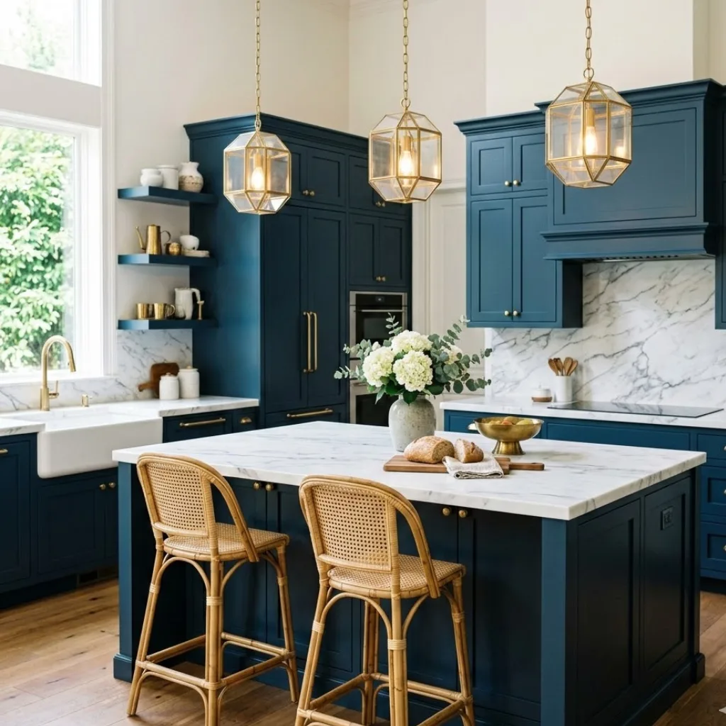 Deep blue cabinets combined with warm brass or gold hardware create instant elegance.