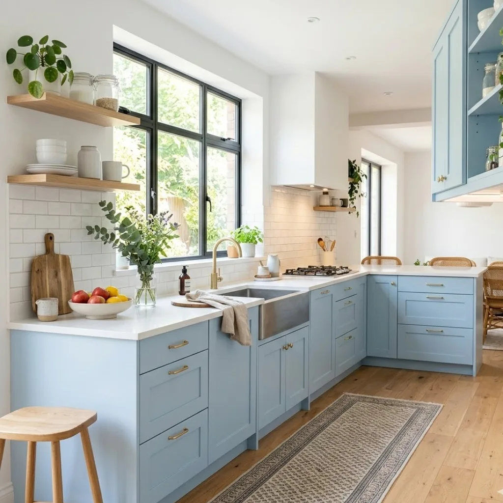 If your kitchen feels a bit cramped or lacks natural light, sky blue cabinets or walls can instantly brighten the space.