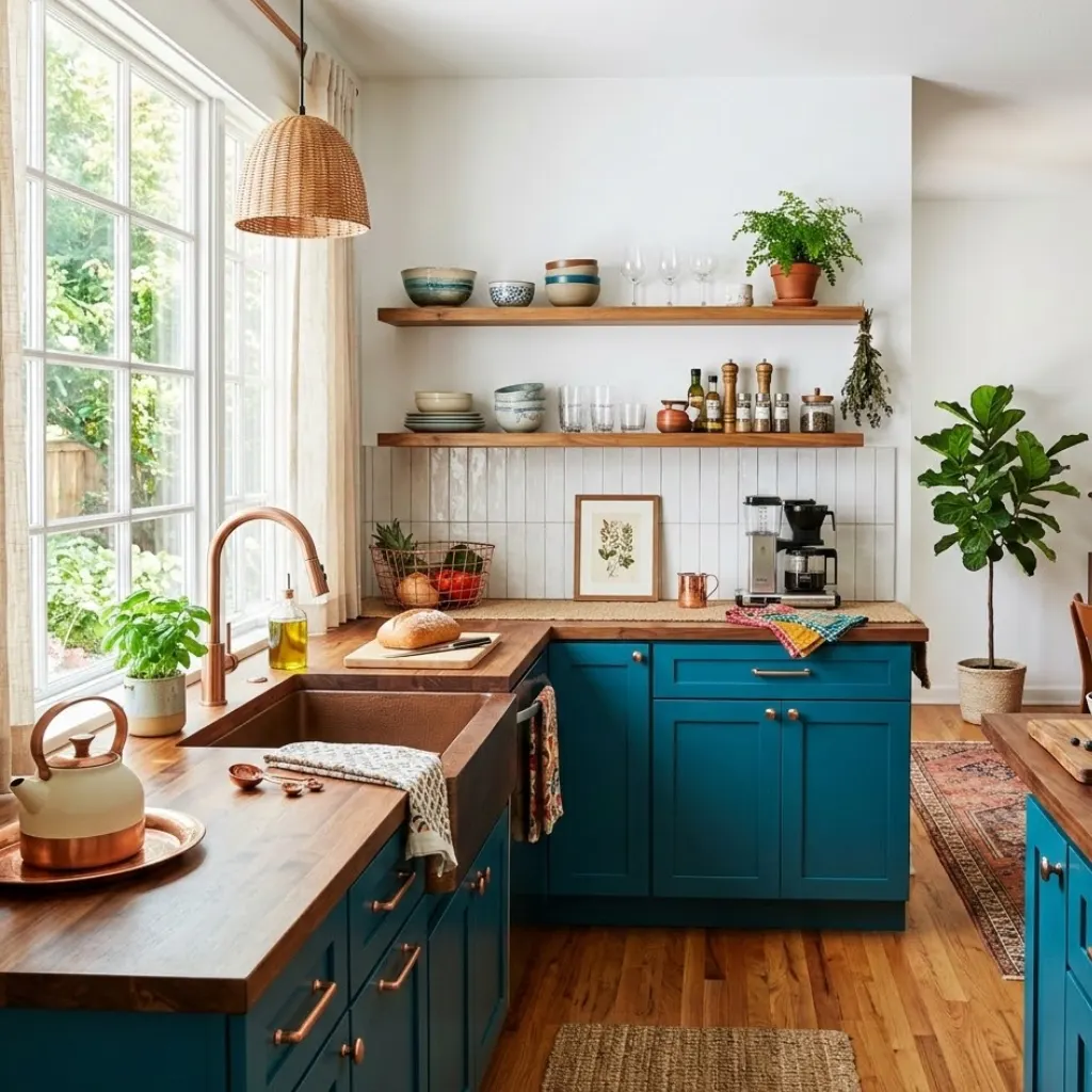 • Teal cabinets for bold personality