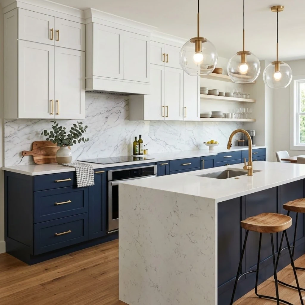 • Navy lower cabinets + white uppers