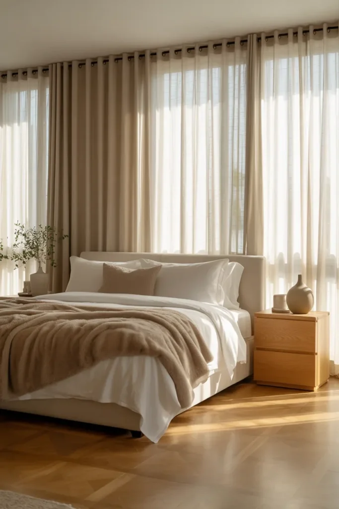 - Linen curtains that softly filter light