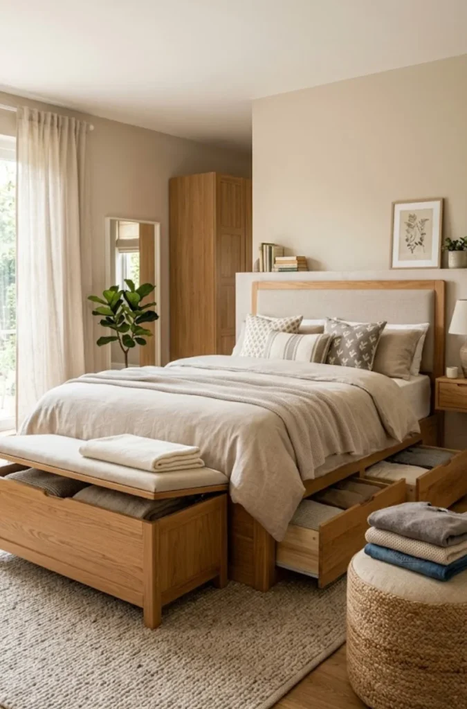 - Beds with drawers underneath can house seasonal clothes.