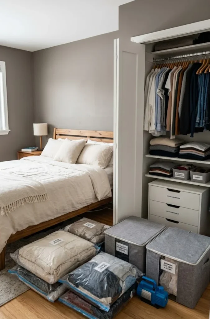 Extra Tip: Use vacuum-sealed bags for bulky winter coats or sweaters—they shrink storage space dramatically.