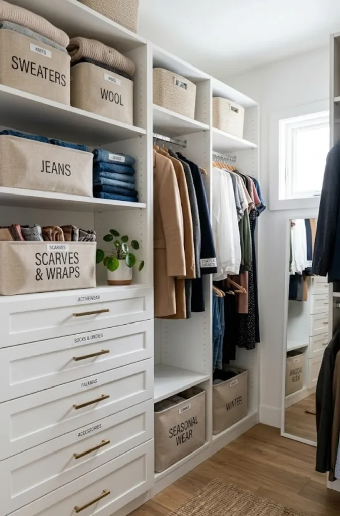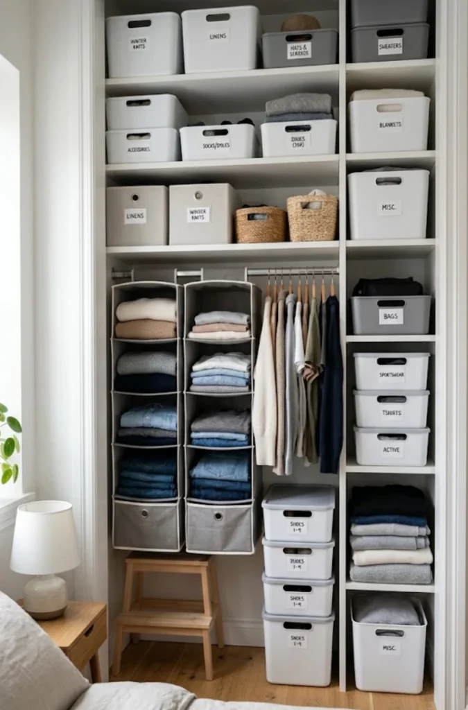 My personal fave: Stackable clear bins labeled by type (e.g., “Summer Tops,” “Winter Jackets”)—it’s like your wardrobe has its own little filing system.