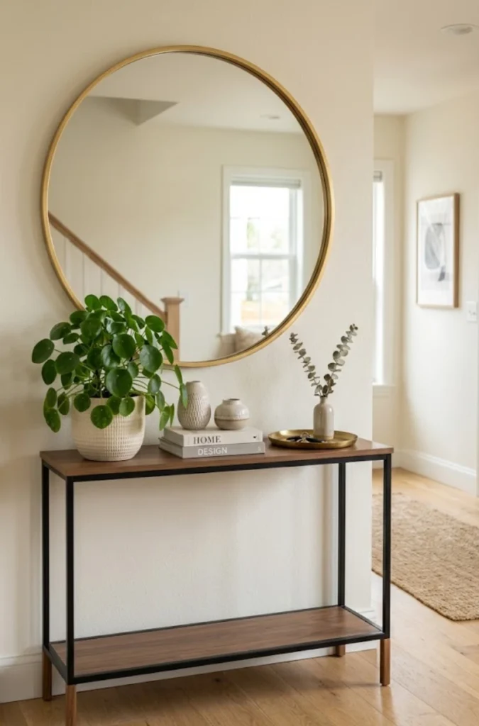 A mirror above your console table is an absolute game-changer, both for functionality and style. Not only does it help make the space feel larger, but it also adds some reflective beauty.