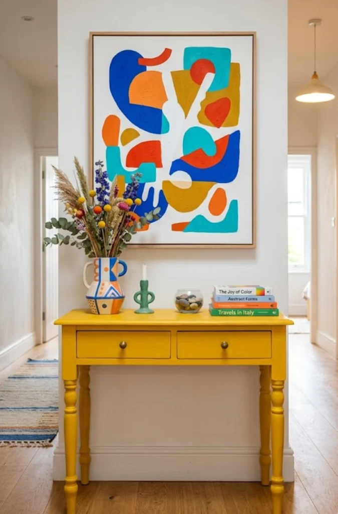 - Choose a bold colored console table like deep blue, emerald green, or mustard yellow.