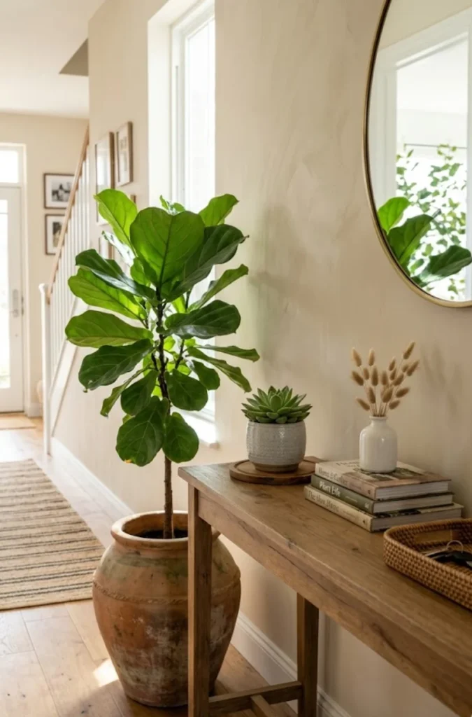 Plants are the easiest way to breathe life into any space, and your hallway is no exception! Whether it’s a small potted plant or a larger leafy beauty, greenery can help transform your console table into a mini indoor garden.