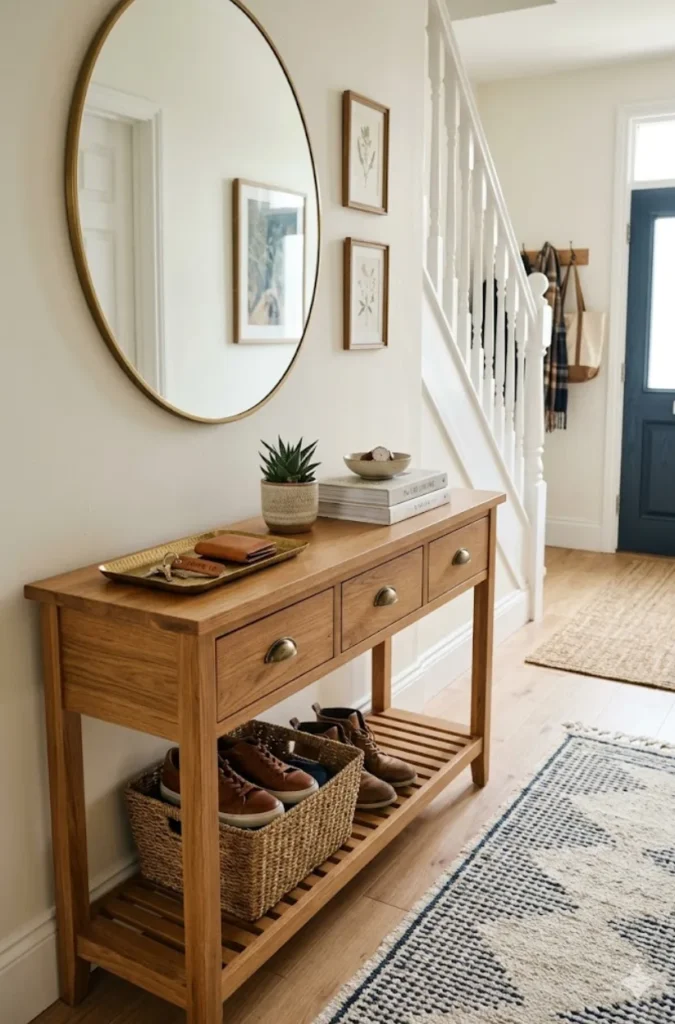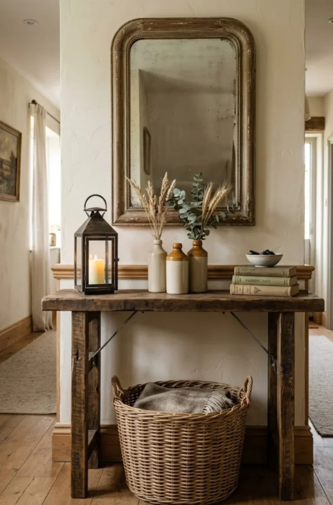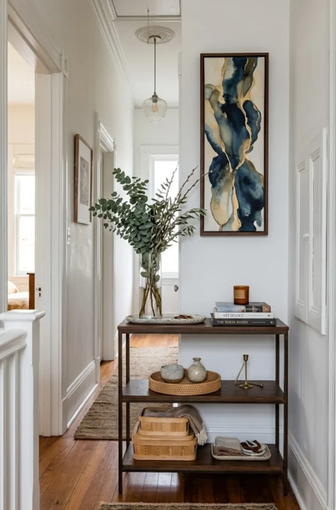 For those who love that warm, cozy feeling, a rustic farmhouse-inspired console table is a perfect fit. It brings in charm, character, and just the right amount of cozy vibes for your hallway.