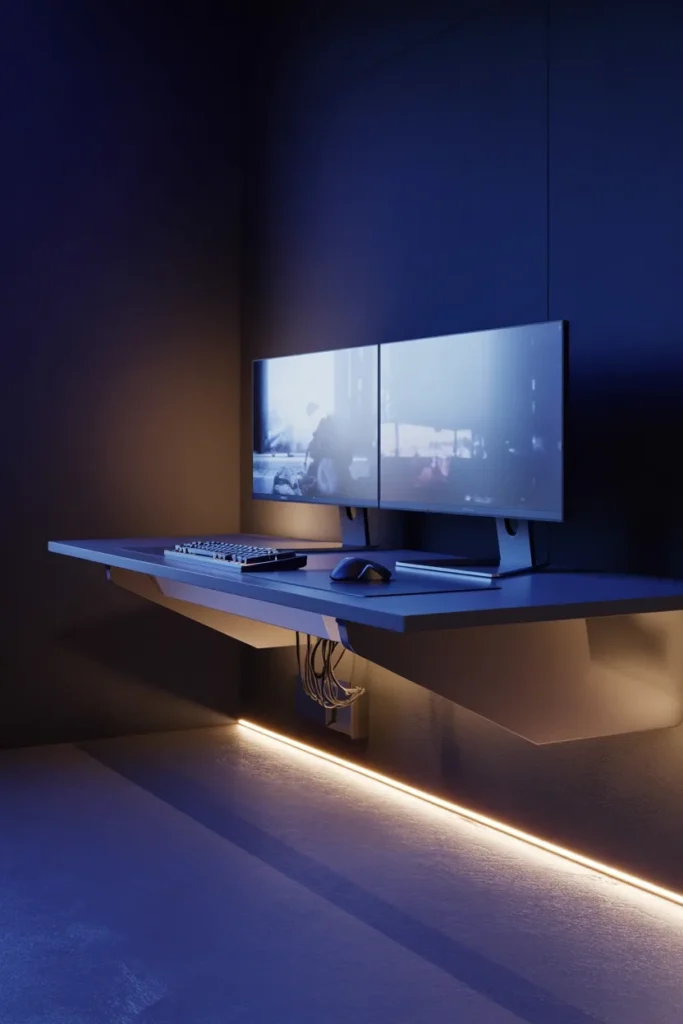 A floating desk setup instantly makes your gaming space look cleaner and more intentional. Why? Because it removes visual clutter from the floor and gives the whole area a sleek, modern vibe. It feels less like “I bought a desk and added lights” and more like “I designed this whole corner on purpose.”