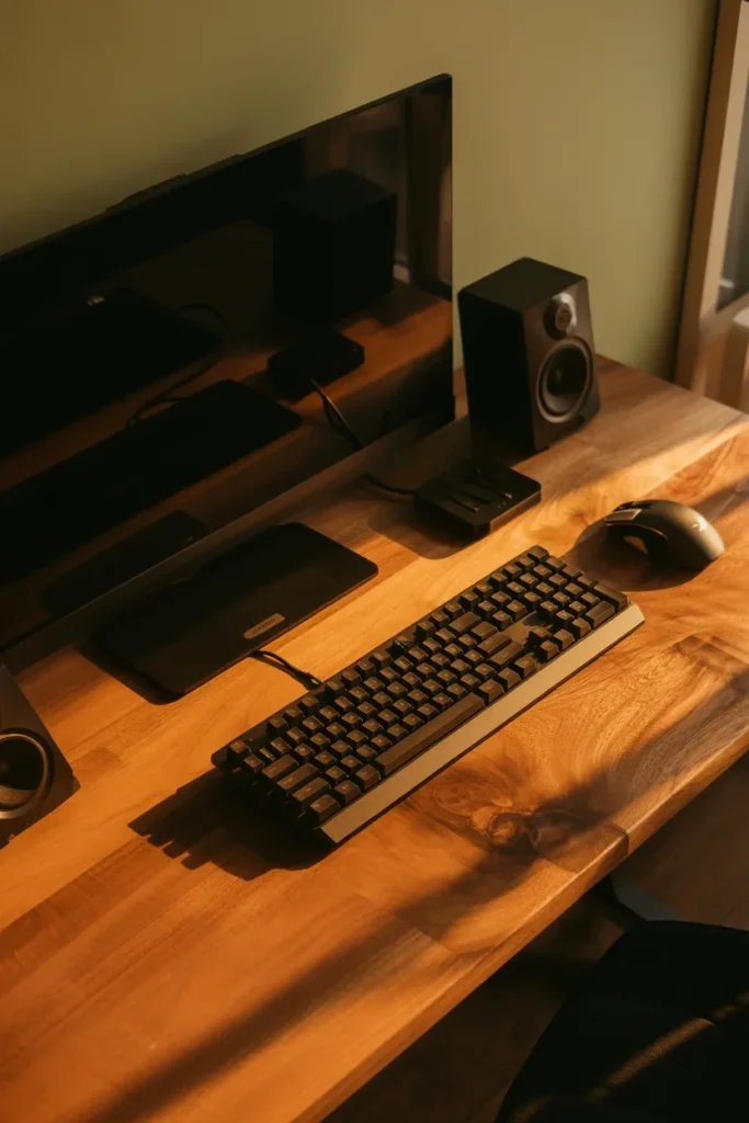 Think about it. A walnut or oak desk surface instantly brings personality to the space. Then you add a black monitor arm, black desk mat, and black speakers, and suddenly the whole setup feels grounded. Not flashy. Not chaotic. Just solid.