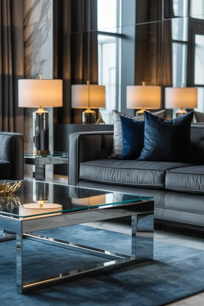 Silver, chrome, brass, or matte black can all work here depending on your style. Gray and blue already have a sleek quality, so the right metal finishes help underline that. A few reflective details can make the room feel more designed and less accidental.