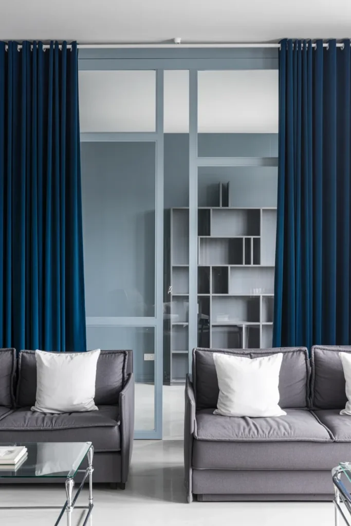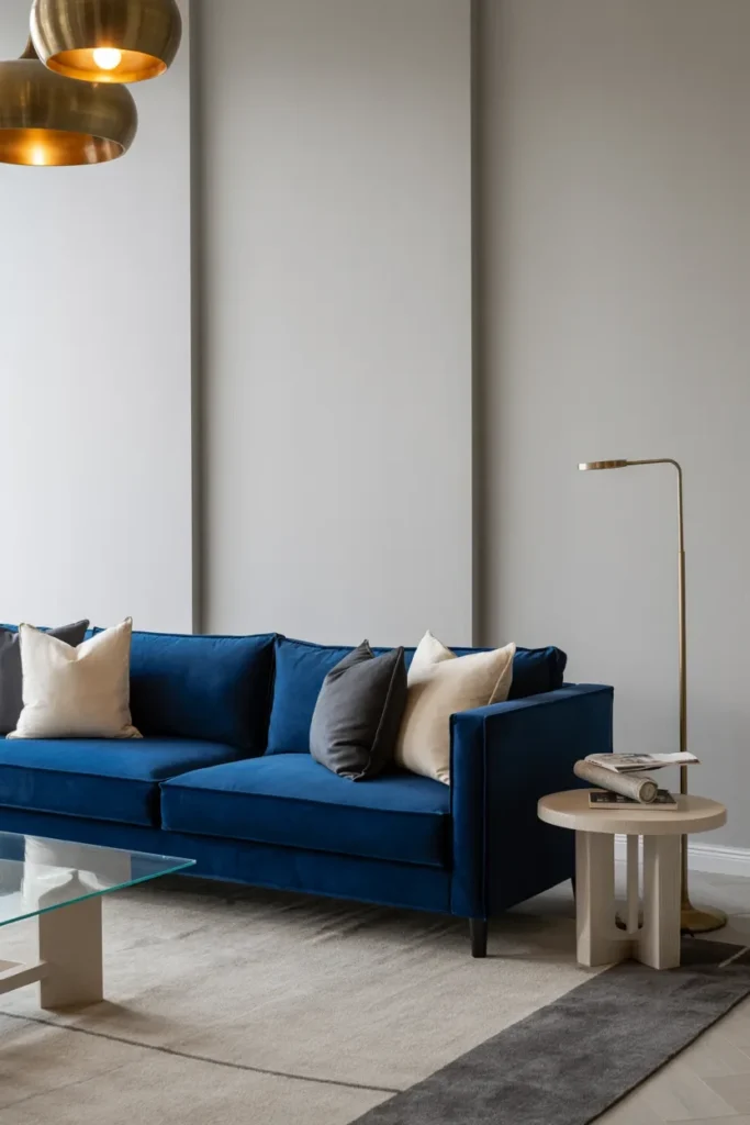 Contrast is what keeps a room memorable. A light gray base paired with deep blue accents creates a crisp, polished look that always feels fresh. Think pale gray walls, a light sofa, then bold navy or cobalt through chairs, curtains, or a feature wall.