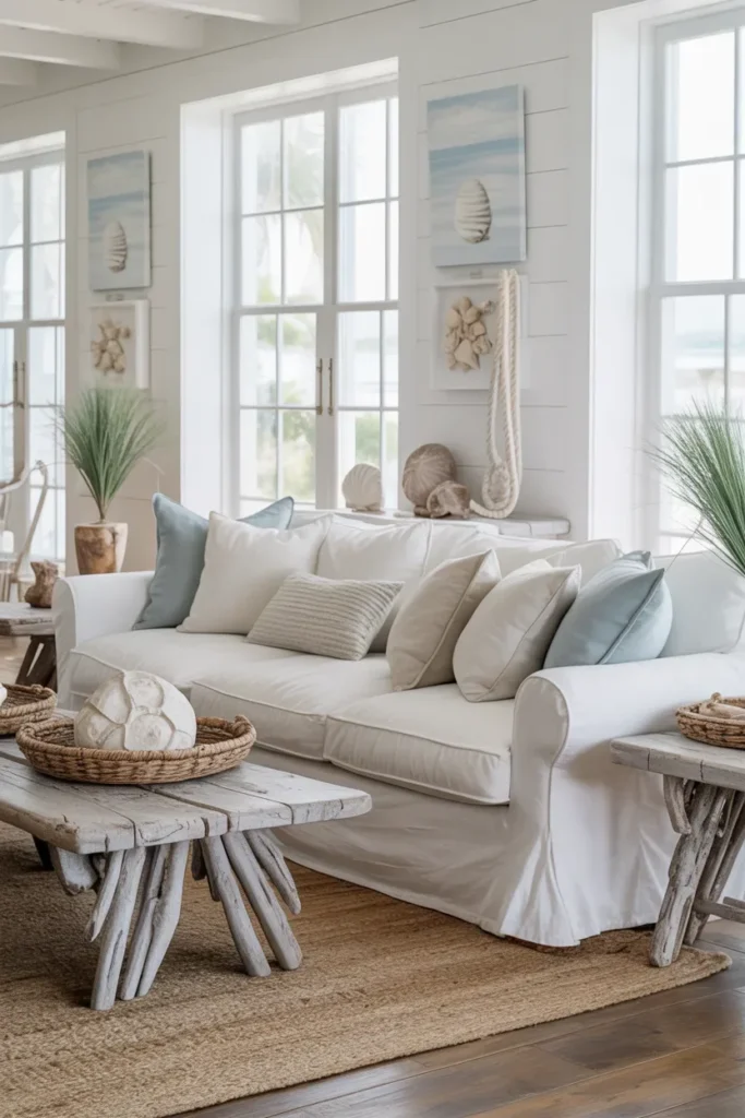 This style is especially great in smaller spaces because it reflects light and keeps everything feeling airy. You don’t need seashell decor or obvious beach themes either. A few subtle nods, like woven textures and soft blue fabrics, are enough to set the mood.