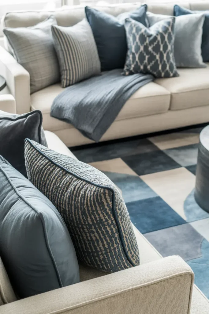 Look for pieces that include multiple shades of blue and at least one neutral tone. That creates a bridge between the walls, furniture, and accessories.
