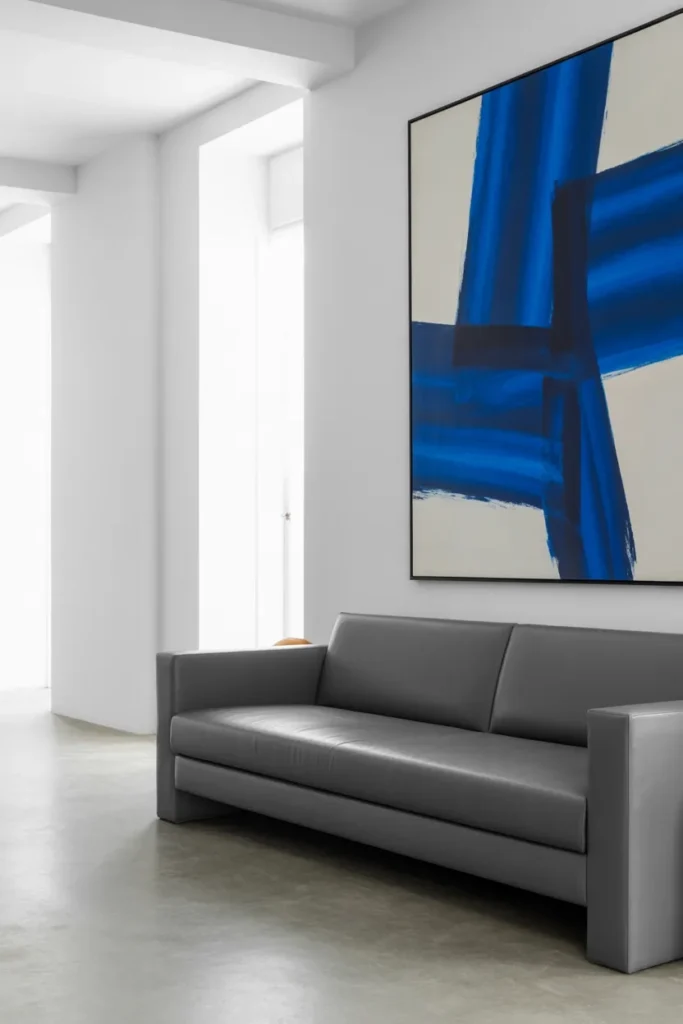 Got a gray living room that feels a little too safe? Art can fix that. Large-scale blue artwork brings color, movement, and mood into the room without forcing you to replace furniture or repaint walls.