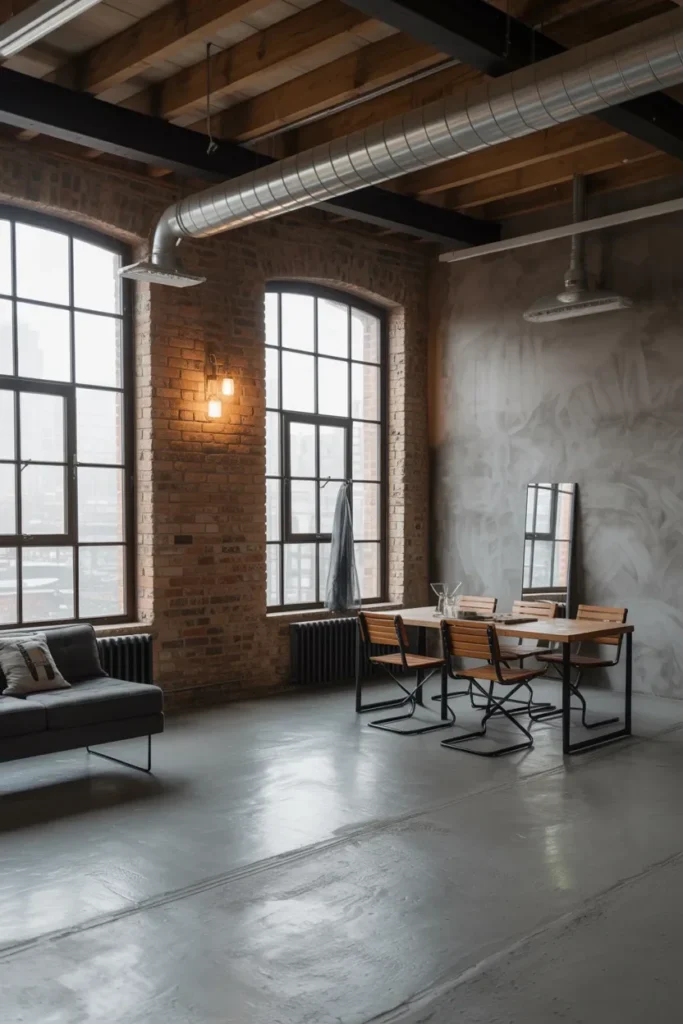 Balance the coolness of concrete with cozy elements like rugs, wood accents, and warm lighting—similar to layering techniques used in cozy living room ideas.