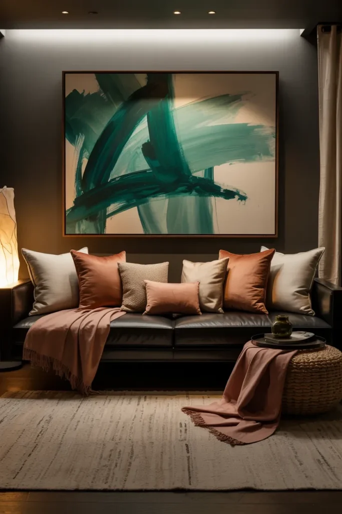 A rug with muted green woven through it can tie a whole room together. So can abstract art with olive, sage, or forest tones. Even a patterned cushion can shift the mood of a neutral room.