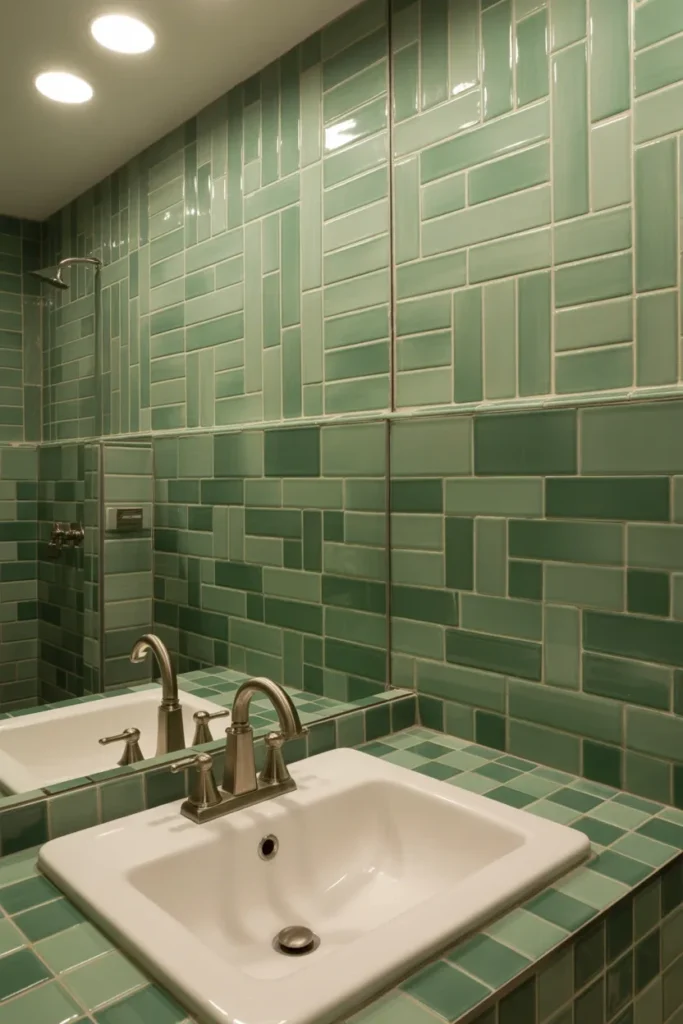 Not ready for bold green walls? An ombre effect is perfect. This is where tiles gradually shift from light mint to deep forest green, creating a fluid, artistic vibe.