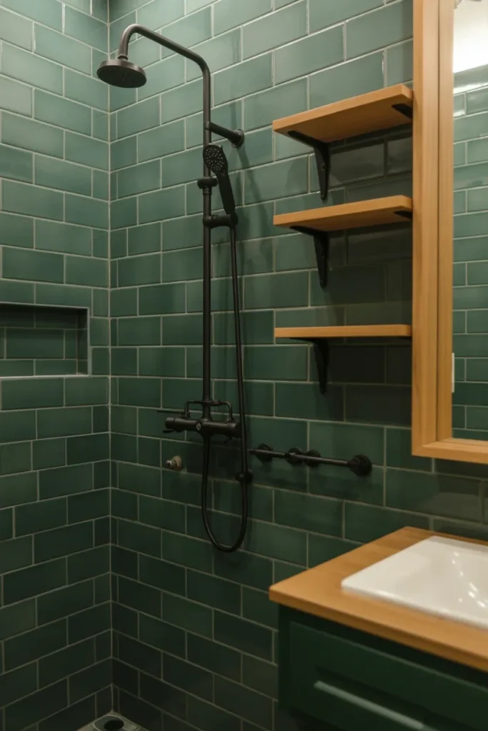 Who said green tiles can’t feel glamorous? Emerald green tiles have this magical ability to make a small bathroom feel chic without being overwhelming.