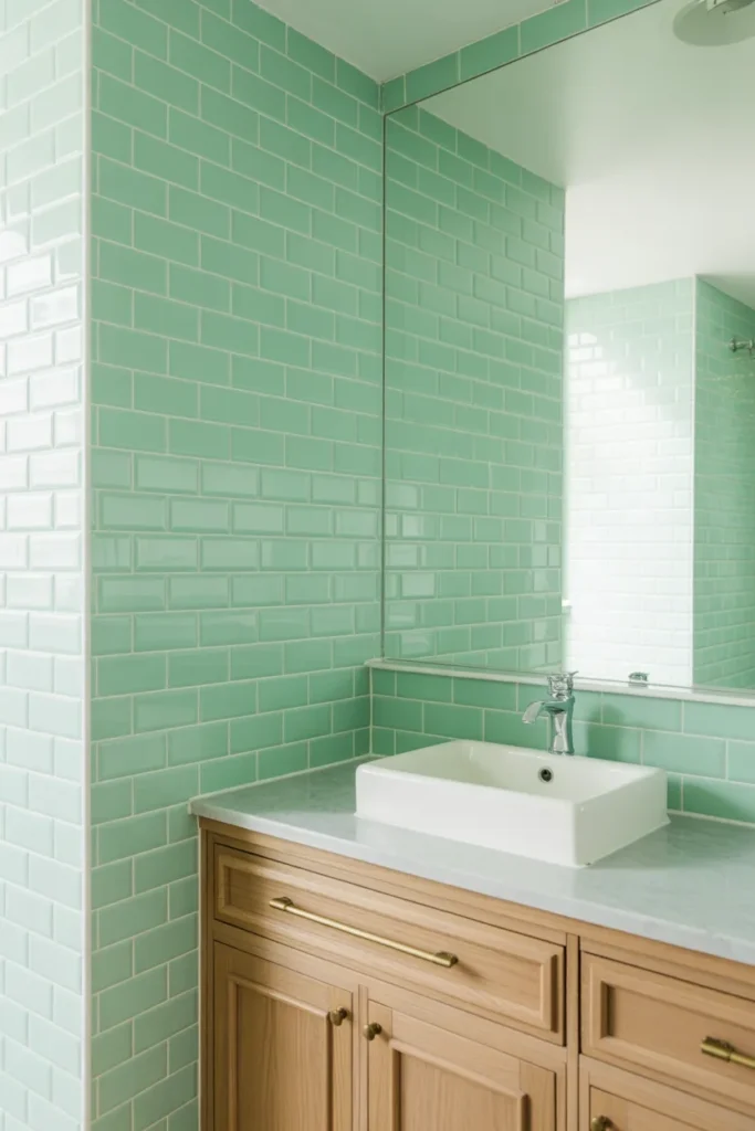 • Mint subway tiles for a retro-cool vibe.