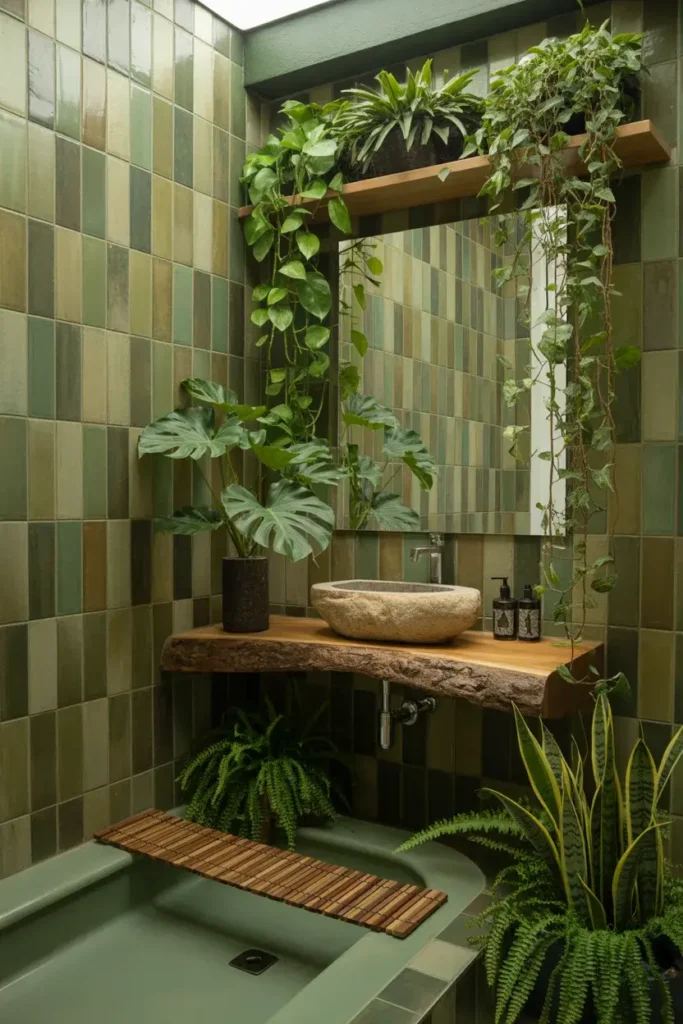 Ever dreamt of showering in a rainforest? 🌴 Jungle-inspired bathrooms are surprisingly doable with the right green tiles. Think deep olive, moss, or even variegated tiles that mimic nature.