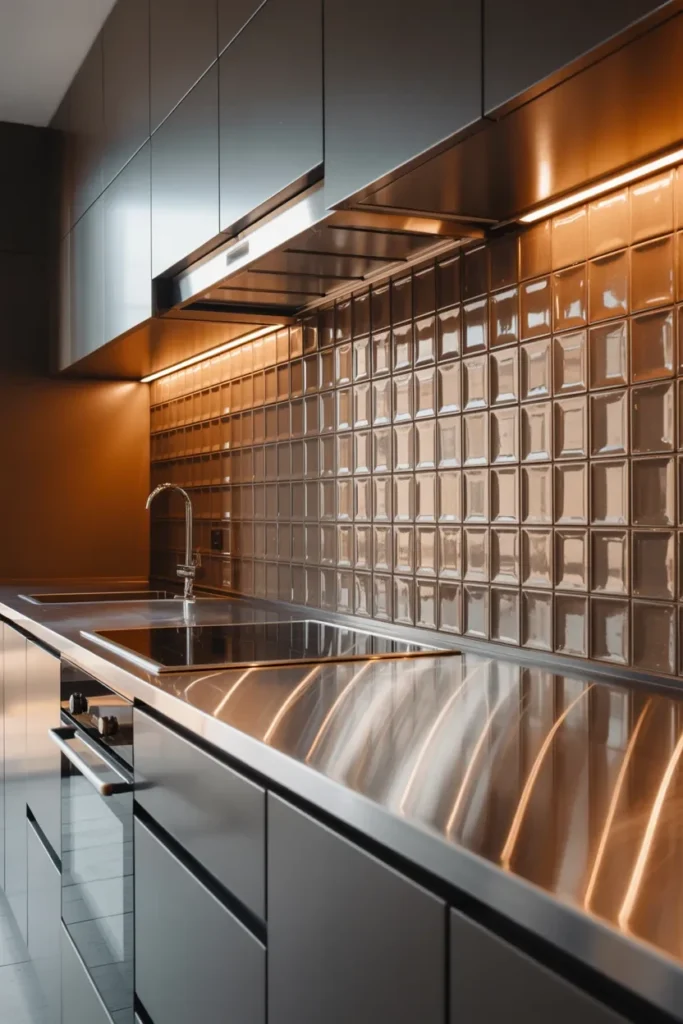 If you’re craving a kitchen that’s sleek, metallic tiles are your best friend. From brushed steel to copper, these tiles catch the light and bring futuristic vibes.