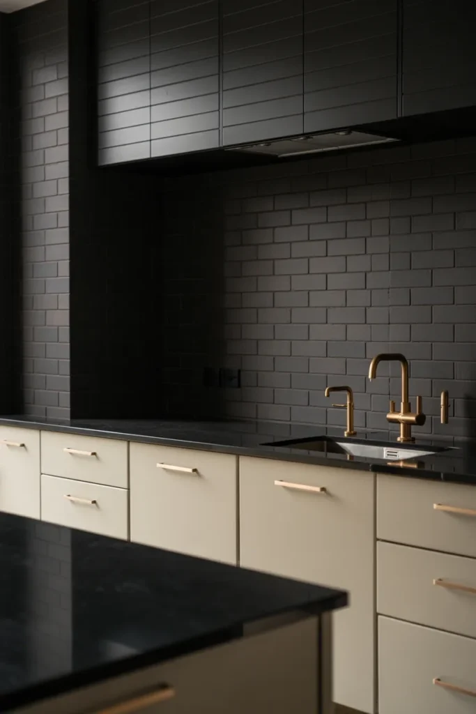 If you’re craving a moody, sophisticated kitchen, matte black tiles are insane in the best way possible. They’re bold, mysterious, and make any metallic accent pop.