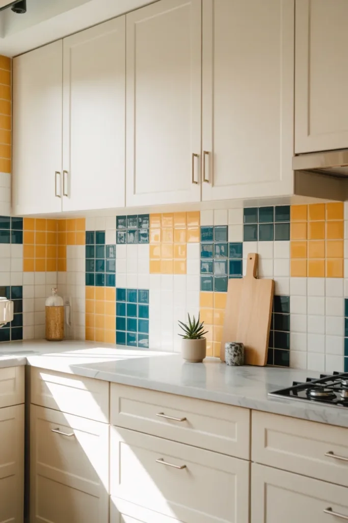 Who said kitchens have to be neutral? Color-blocked tiles are insane but fun. Imagine a wall split into deep teal and sunny yellow—it instantly brightens the space and sparks creativity while cooking.