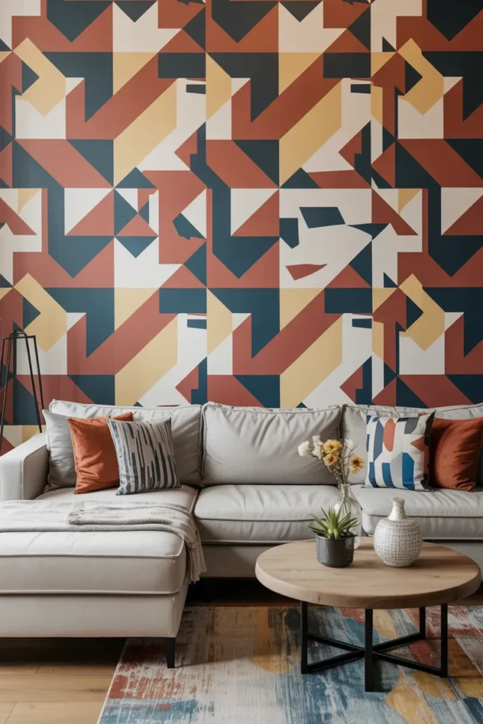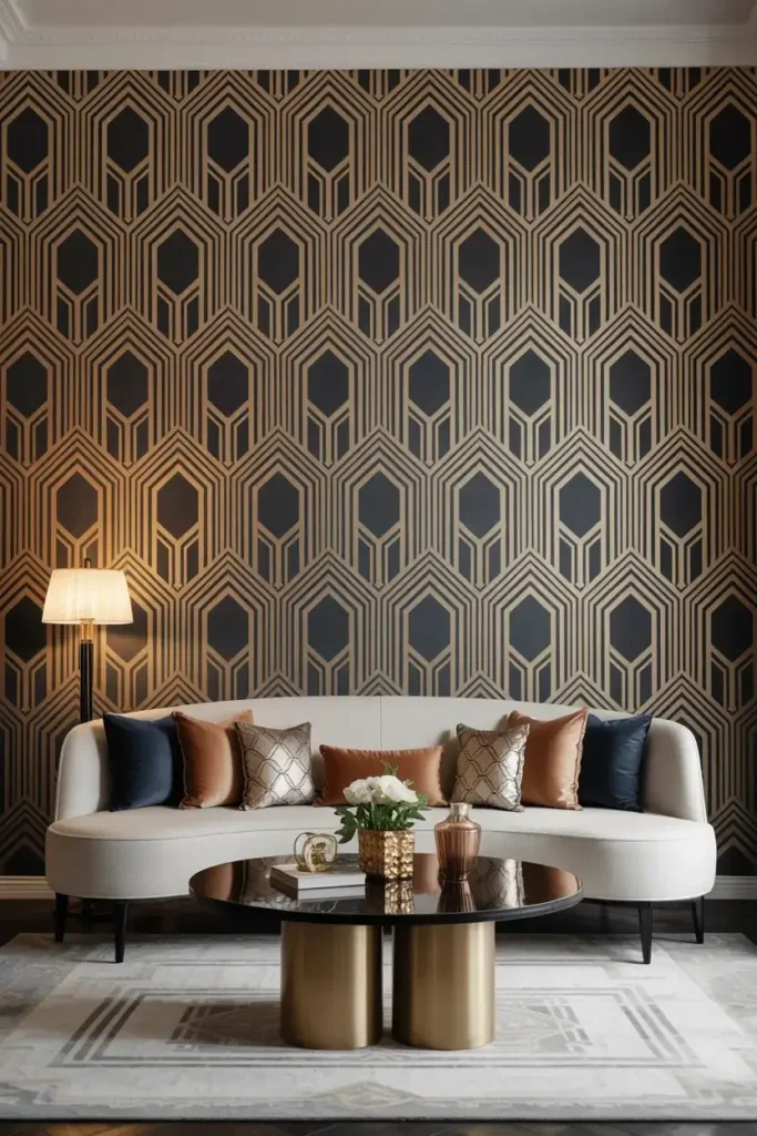 Want your living room to have that “old Hollywood” glamour? Art Deco wallpaper is all about bold patterns, metallic finishes, and luxurious textures. Think gold, black, and rich jewel tones. It’s a design style that screams sophistication and luxury, and it’s perfect for those who want to make a statement.