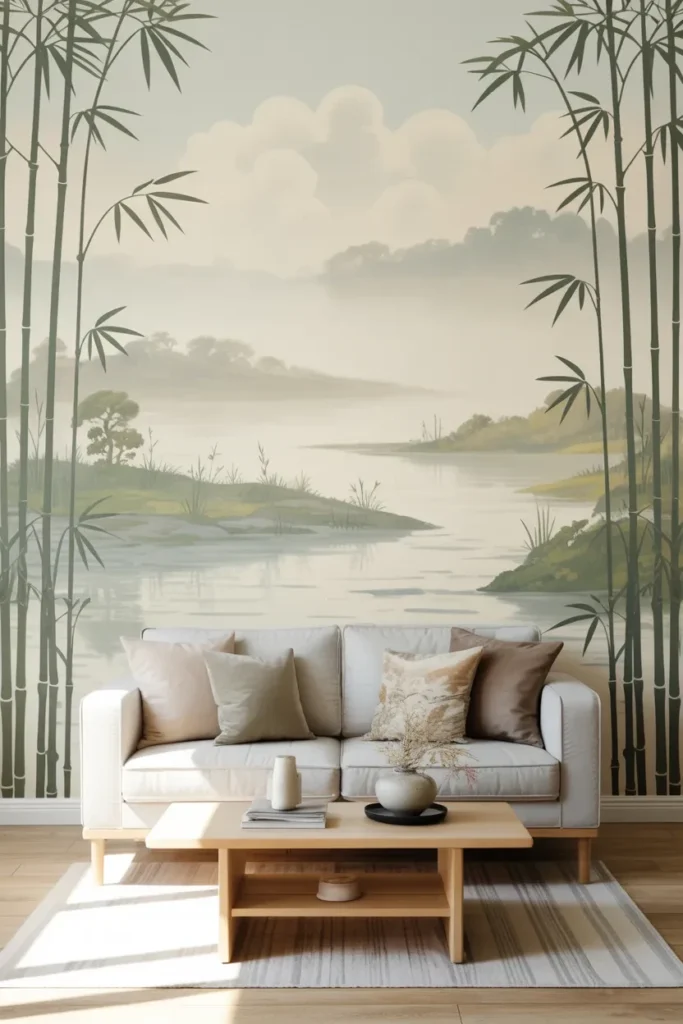 Inspired by Zen gardens and traditional Japanese design, this wallpaper style focuses on calm, soothing colors and minimalistic designs. Think soft beige, gentle grays, and serene landscapes. If you’re into the idea of creating a peaceful sanctuary in your living room, this is it.
