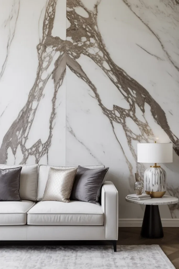 Now, who doesn’t love a little bit of luxury? Marble wallpaper gives your living room that opulent vibe without the price tag. Whether you opt for white marble with subtle grey veins or a bolder, darker shade, this wallpaper brings elegance to your space instantly.