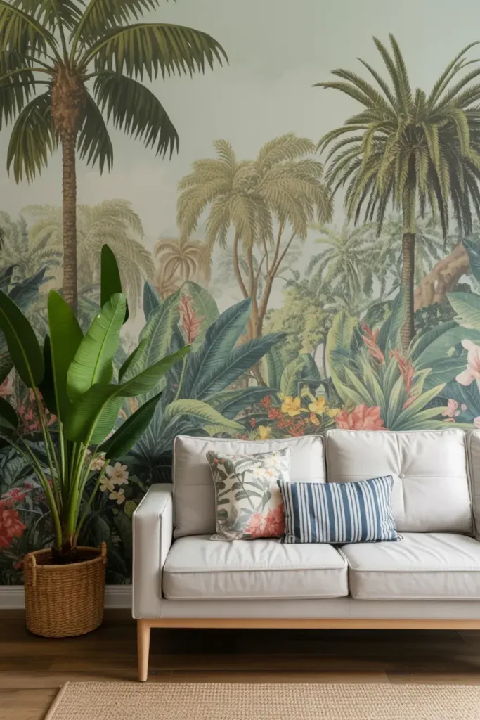 If you’ve ever dreamed of bringing a little slice of the jungle into your living room, this is the way to do it. Imagine lush greenery, oversized leaves, and tropical flowers wrapping around your walls. It’s the ultimate escape, right from the comfort of your couch.