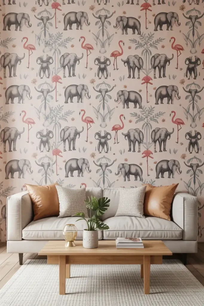 Feeling playful? Go for a whimsical animal print wallpaper to add a touch of fun to your living room. We’re not talking about the typical zebra or leopard prints (unless that’s your thing), but rather artistic renditions of animals – think illustrated elephants, flamingos, or jungle creatures!