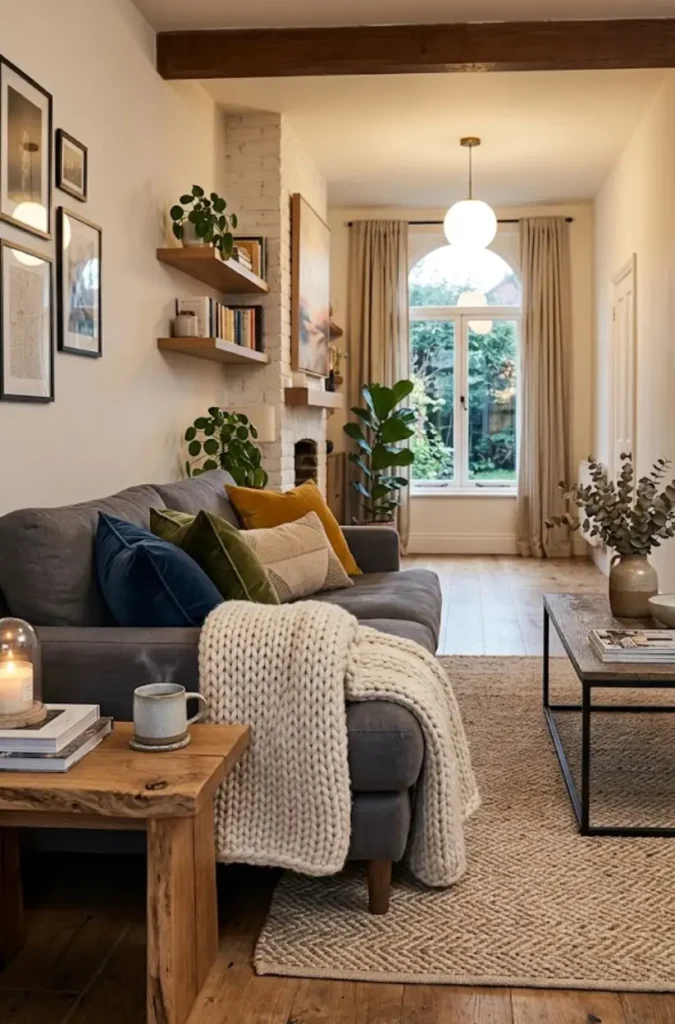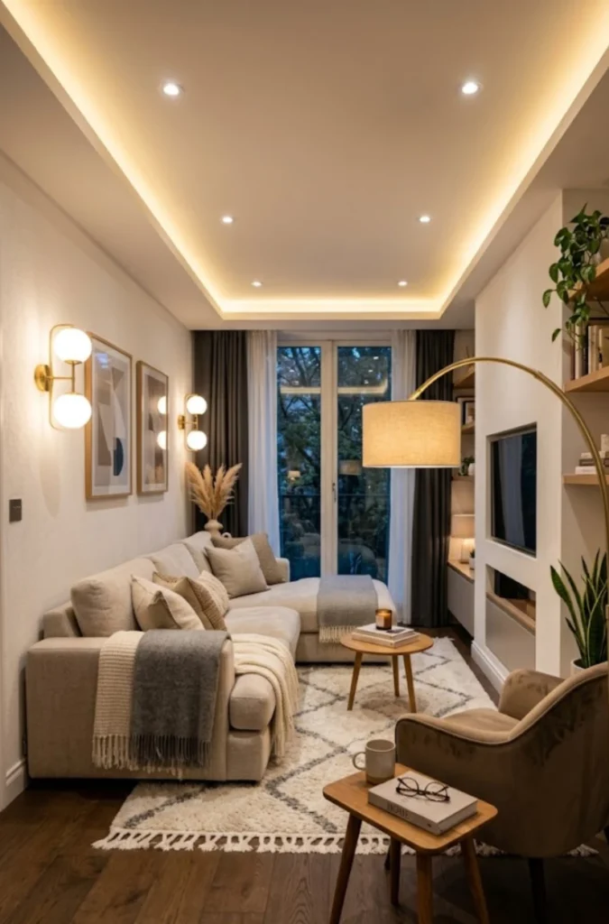 Long living rooms often feel dim if they rely on a single ceiling light. Layering your lighting makes a big difference.