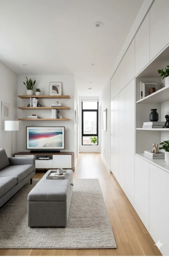 Clutter is the enemy of style, especially in narrow rooms. Thankfully, smart storage keeps things tidy without eating up precious floor space.