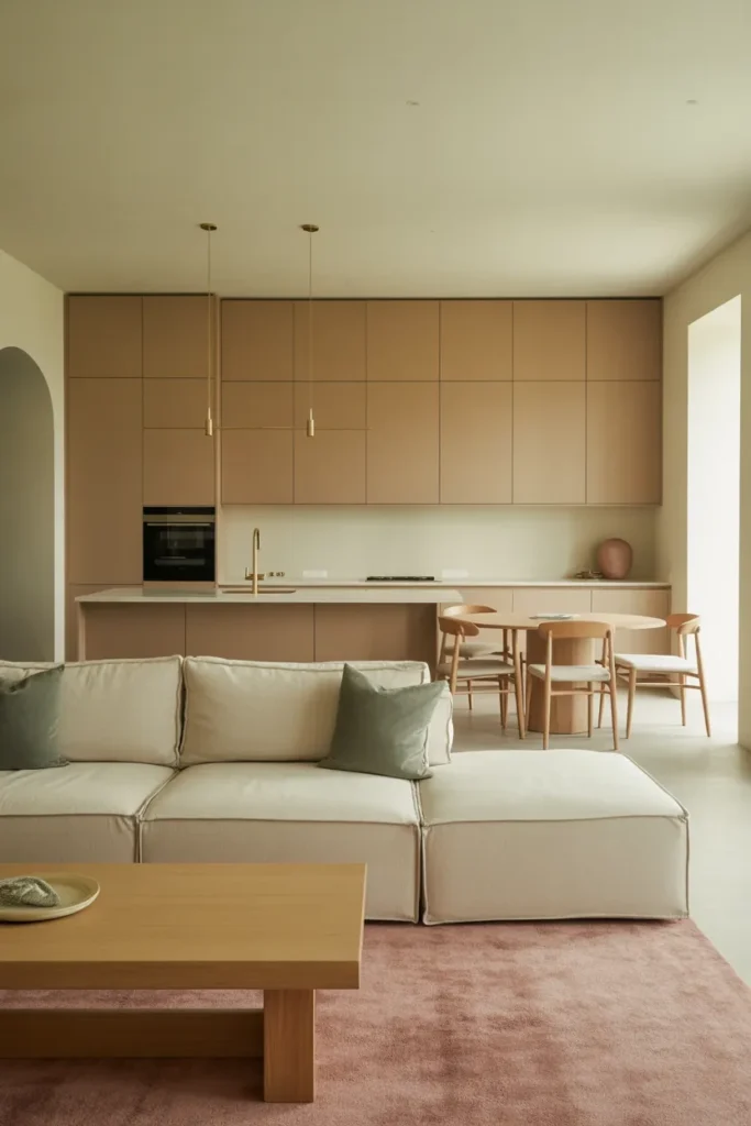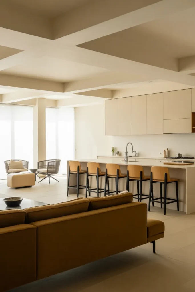 • Low-profile sofas: Keep the eye line open so the kitchen stays visible.