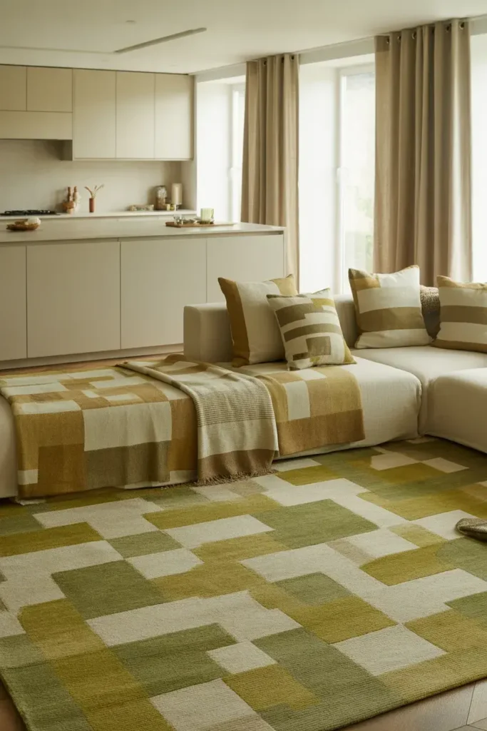 Textiles aren’t just cozy—they’re connectors. Rugs, cushions, and curtains can visually tie two areas together.