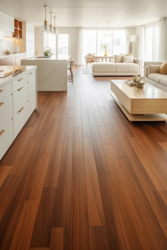 • Same material: Hardwood, laminate, or polished concrete can unify spaces.