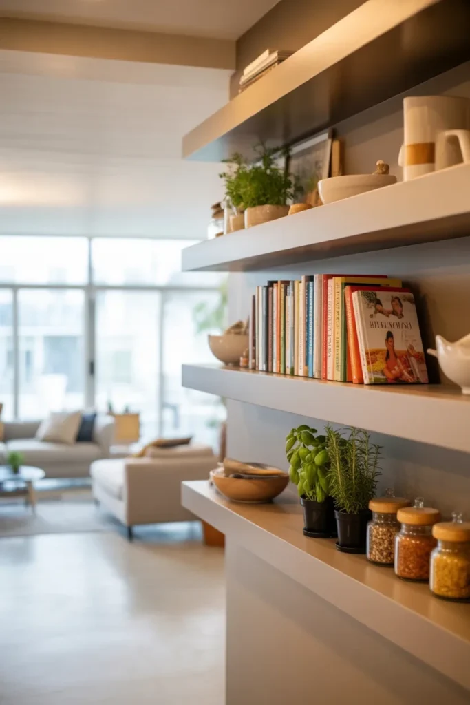 • Hidden storage: Use cabinets, drawers, and pantries to reduce visible chaos.