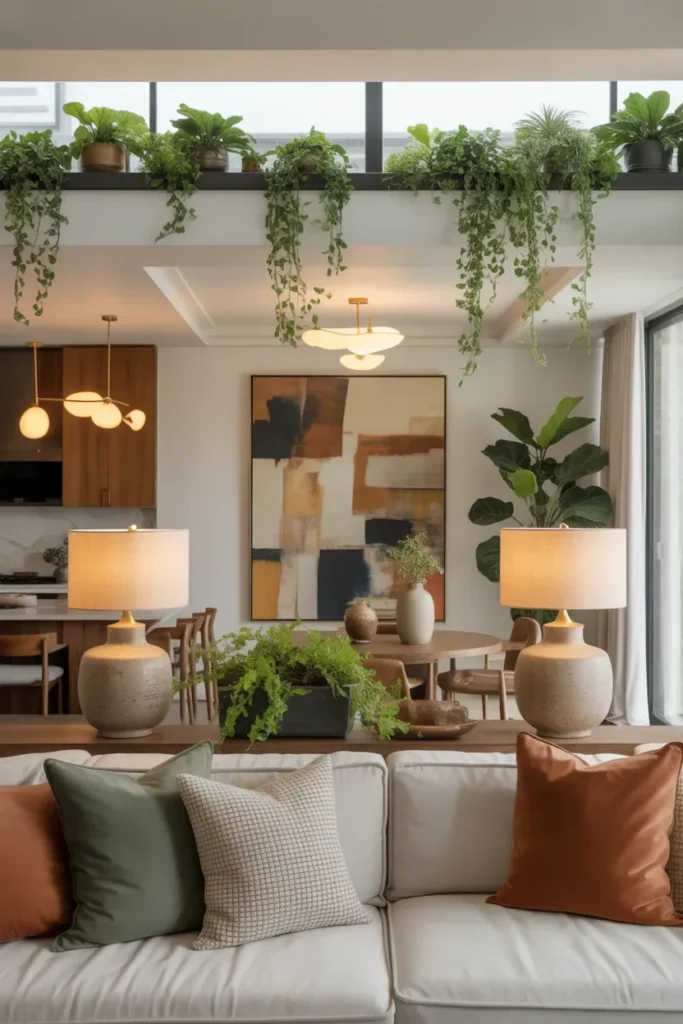 • Plants: Tall greenery near the kitchen edge can guide the eye naturally.