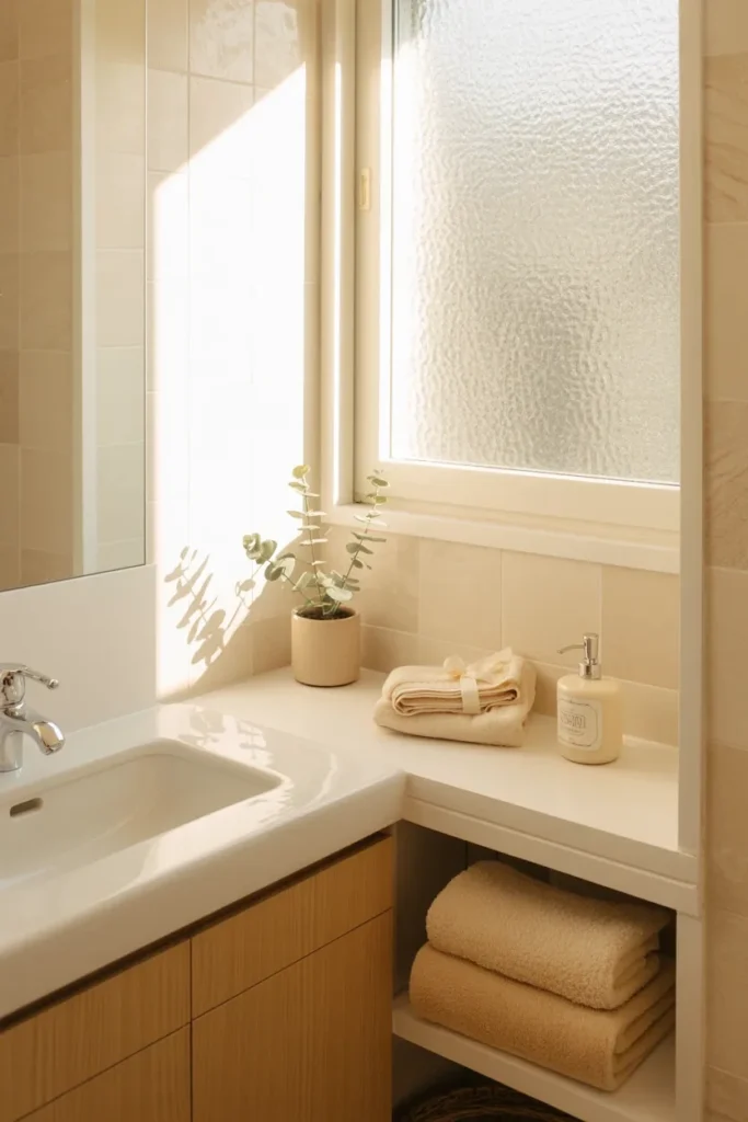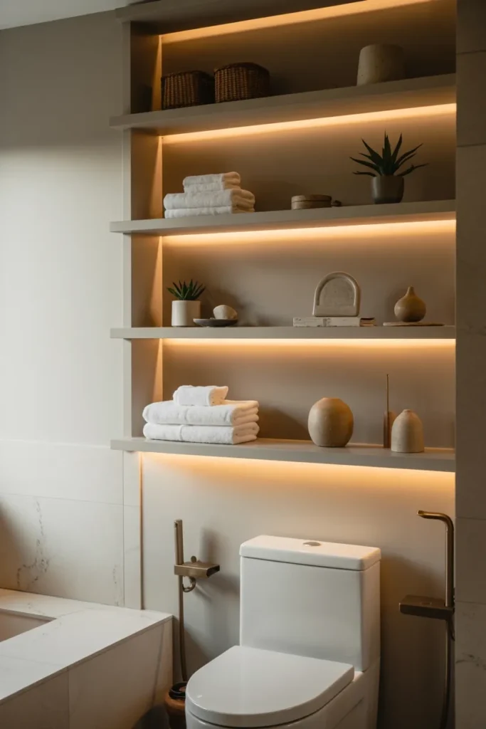 Open shelves above the toilet or beside the vanity can hold daily items without making the room feel heavy. They are perfect for towels, jars, small plants, and pretty containers.