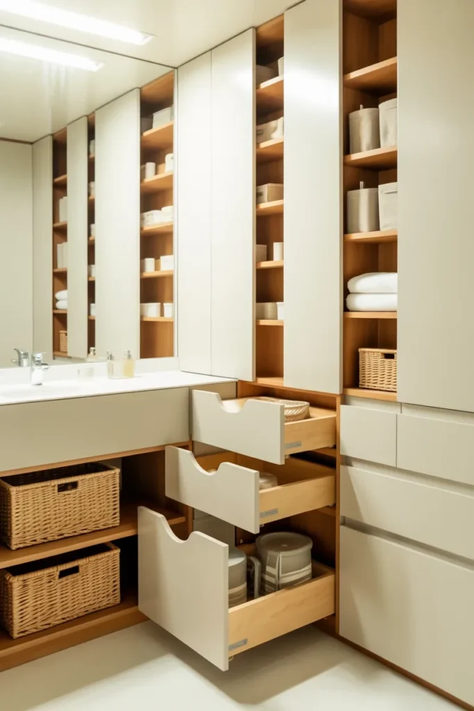 Storage in small bathrooms has to be clever. There is no room for random junk drawers or giant cabinets full of half-used products you forgot you owned three years ago. Every storage solution should serve a real purpose.
