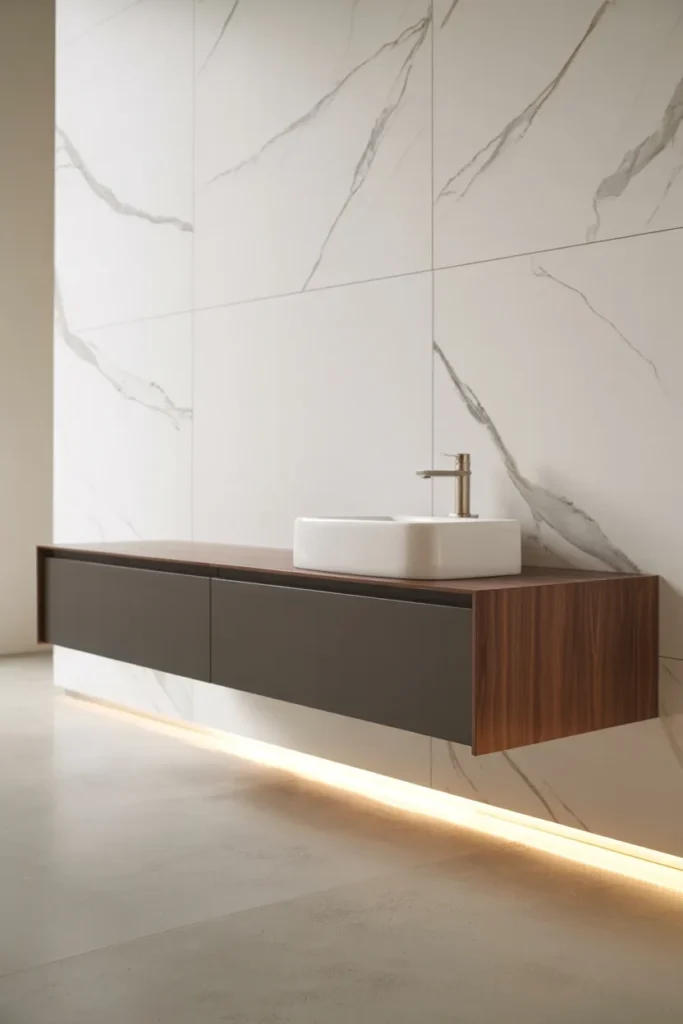 This is one of my favorite ideas because it blends style and function so well. Floating vanities feel modern, clean, and less visually heavy than traditional cabinets.