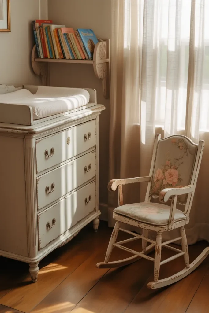 Here’s where your creativity can shine. Adding a few antique furniture pieces can elevate your nursery instantly.